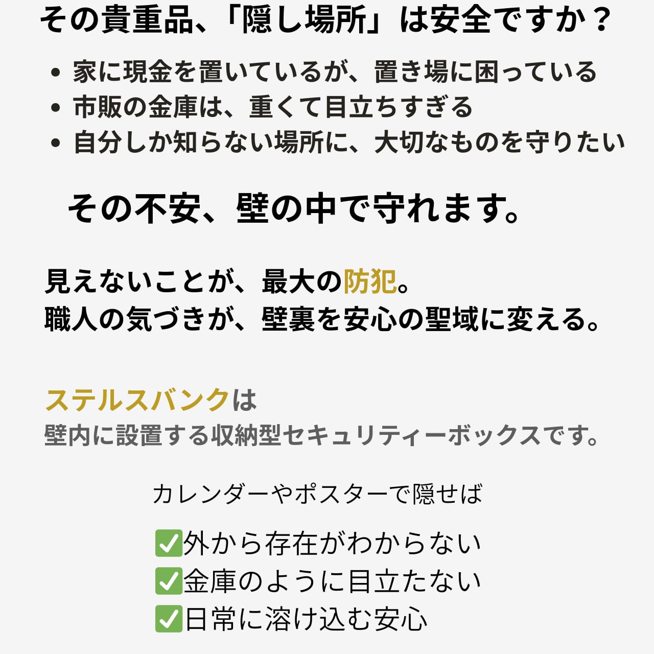 開発背景 「大切なものを、どこに隠すか?」 私たちが開発し、意匠登録を完了した「砦-TORIDE-BOX」。津波や洪水で建物が損壊しても、地盤さえあれば中身を守り抜く――そんな強固な思想から生まれたプロダクトです。 昨今の世界情勢による「純金」の高騰や、今なお続く「タンス貯金」の習慣。しかし、個人や小規模事業者にとって、大きな金庫は場所を取り、かえって「ここに貴重品がある」と周囲に知らせてしまうリスクにもなります。 そこで誕生したのが、この**『ステルスバンク』**です。 「隠す」と「見せる」を、壁一枚で。 保管場所を「床」から「壁面」へ。 ポスターやカレンダーの裏に潜ませる「究極のシークレット金庫」としての顔。 お気に入りの腕時計やコレクションを飾る「壁面ギャラリー」としての顔。 深さわずか4cm。石膏ボードの壁を活用した、これまでにないスマートな保管体験をご提案します。 余談ですが… この小さなサイズながら、純金のインゴット(1kg)が最大4本収納可能です。2026年現在の金相場では、約1億円相当を壁の中に収めることができます。 【ステルスバンクの2つの顔】 「隠す」:他人に見せないための秘密基地 金インゴット、現金、証券類、通帳など。 「見せる」:自分だけの壁ギャラリー 高級時計、趣味の逸品、大切な思い出の品。 ■こんな方におすすめ 現金や貴金属を、場所を取らずに家庭内で保管したい。 「いかにも金庫」な見た目を避け、インテリアに馴染ませたい。 収納内のデッドスペース(壁の中)を有効活用したい。 ■製品仕様 名称: ステルスバンク 種別: 壁面埋め込み式 金属製保管箱 サイズ: 【内寸】縦17cm × 横10cm × 深さ4cm 【外寸】縦22cm × 横15cm(取付ツバ含む) 材質: 金属製(樹脂製に比べ、熱や変形に強い堅牢設計) ■お届け内容 本体・フタ ビス:計8本(本体用、下地用、フタ用) 桟木(サンギ):2本 商品説明書 ■取り付けについて 本製品は、壁に穴を開けて設置するタイプです。 必要ツール: 鉛筆、引き回しノコ、プラスドライバー 条件: 壁の表面から45mm以上の空洞がある場所 隠し方のヒント: 設置後、上からポスターや額縁を飾ることで、完全に視界から消すことができます。 ※設置サポート(取付サービス)も準備中です。詳しくはお問い合わせください。 ■FAQ Q. 石膏ボードに自分で取り付けられますか? A. はい、商品の上蓋を壁に当てて鉛筆などで描いて壁をカットし、ネジ留めするだけで設置可能です。 Q. ビスの頭は見えますか? A. ビス頭はわずかに出ますが、壁とほぼフラット(面一)になります。 そのままでも目立ちませんが、上からカレンダー等を掛けるのに最適な設計です。 ■予約販売のご案内 発送予定:5月1日〜5月10日頃より順次 ご注意: 予約販売のため、決済後のキャンセルは不可となります。