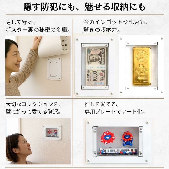 開発背景 「大切なものを、どこに隠すか?」 私たちが開発し、意匠登録を完了した「砦-TORIDE-BOX」。津波や洪水で建物が損壊しても、地盤さえあれば中身を守り抜く――そんな強固な思想から生まれたプロダクトです。 昨今の世界情勢による「純金」の高騰や、今なお続く「タンス貯金」の習慣。しかし、個人や小規模事業者にとって、大きな金庫は場所を取り、かえって「ここに貴重品がある」と周囲に知らせてしまうリスクにもなります。 そこで誕生したのが、この**『ステルスバンク』**です。 「隠す」と「見せる」を、壁一枚で。 保管場所を「床」から「壁面」へ。 ポスターやカレンダーの裏に潜ませる「究極のシークレット金庫」としての顔。 お気に入りの腕時計やコレクションを飾る「壁面ギャラリー」としての顔。 深さわずか4cm。石膏ボードの壁を活用した、これまでにないスマートな保管体験をご提案します。 余談ですが… この小さなサイズながら、純金のインゴット(1kg)が最大4本収納可能です。2026年現在の金相場では、約1億円相当を壁の中に収めることができます。 【ステルスバンクの2つの顔】 「隠す」:他人に見せないための秘密基地 金インゴット、現金、証券類、通帳など。 「見せる」:自分だけの壁ギャラリー 高級時計、趣味の逸品、大切な思い出の品。 ■こんな方におすすめ 現金や貴金属を、場所を取らずに家庭内で保管したい。 「いかにも金庫」な見た目を避け、インテリアに馴染ませたい。 収納内のデッドスペース(壁の中)を有効活用したい。 ■製品仕様 名称: ステルスバンク 種別: 壁面埋め込み式 金属製保管箱 サイズ: 【内寸】縦17cm × 横10cm × 深さ4cm 【外寸】縦22cm × 横15cm(取付ツバ含む) 材質: 金属製(樹脂製に比べ、熱や変形に強い堅牢設計) ■お届け内容 本体・フタ ビス:計8本(本体用、下地用、フタ用) 桟木(サンギ):2本 商品説明書 ■取り付けについて 本製品は、壁に穴を開けて設置するタイプです。 必要ツール: 鉛筆、引き回しノコ、プラスドライバー 条件: 壁の表面から45mm以上の空洞がある場所 隠し方のヒント: 設置後、上からポスターや額縁を飾ることで、完全に視界から消すことができます。 ※設置サポート(取付サービス)も準備中です。詳しくはお問い合わせください。 ■FAQ Q. 石膏ボードに自分で取り付けられますか? A. はい、商品の上蓋を壁に当てて鉛筆などで描いて壁をカットし、ネジ留めするだけで設置可能です。 Q. ビスの頭は見えますか? A. ビス頭はわずかに出ますが、壁とほぼフラット(面一)になります。 そのままでも目立ちませんが、上からカレンダー等を掛けるのに最適な設計です。 ■予約販売のご案内 発送予定: 4月1日〜4月10日頃より順次 ご注意: 予約販売のため、決済後のキャンセルは不可となります。